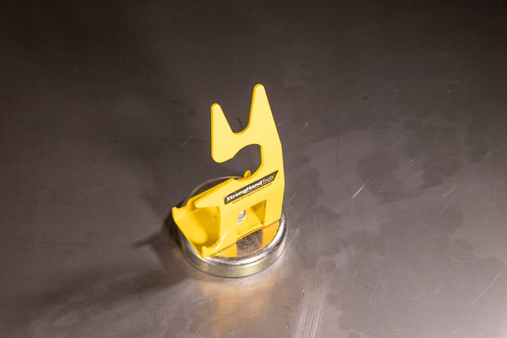 Kätevä teline TIG-polttimelle. Telineen pohjassa on voimakas magneetti, jolla teline pysyy työpöydässä kiinni. Telineessä on myös hahlot lisäainelangoille.
